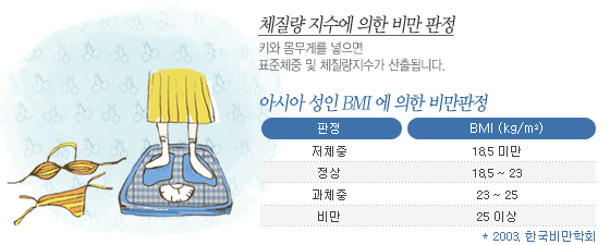 ex) 177§¯, 75§¸ Àΰæ¿ì BMI = 75/1.77*1.77 = 24.49§¸/§³